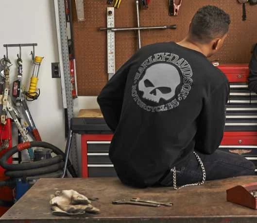 Originales Harley-Davidson Skull Longsleeve aus 100% Baumwolle mit Rippstrick-Halsausschnitt und Ärmelbündchen.
