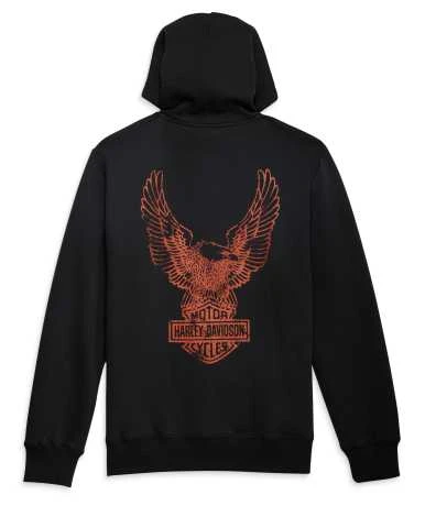 Original Harley-Davidson Herren Zip Hoodie (Kapuzenjacke mit Reißverschluss). Die Harley-Davidson Ikone ist da, aber nicht mehr lange mit unserem Limited Edition Road Captain Zip-Up Hoodie. Große, auffällige Grafiken kombinieren sich mit hochwertigen Materialien für das Beste an Stil und Komfort. Der Kapuzenpullover aus 100 % Baumwollfleece ist in einer traditionellen und einer maßgeschneiderten Slim-Fit-Silhouette erhältlich und sorgt für Wärme und ein superweiches Tragegefühl. Die aufsteigende Eagle-Siebdruckgrafik ist so schön, dass wir sie zweimal verwendet haben: auf der Brust und in Übergröße auf dem Rücken. Ein gewebtes Etikett ziert die Tasche. Und für einen Farbakzent haben wir die Kapuze mit unserem charakteristischen Orange gefüttert.