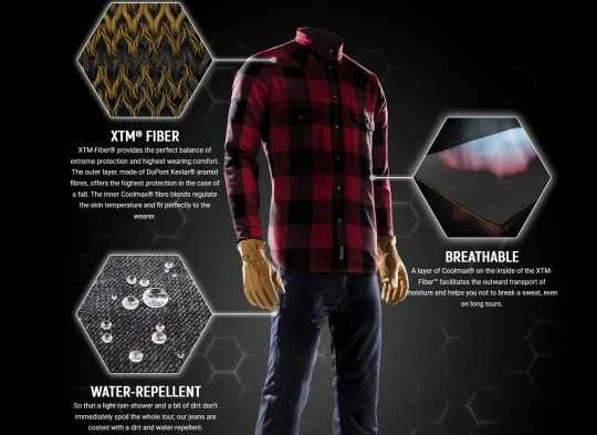 Das JDM Motoshirt mit XTM-Fiber ® wurde speziell für das Motorradfahren entworfen. Es vereinigt einen tollen klassischen Look mit neuester Sicherheitstechnologie. Die hohe Funktionalität und den entsprechenden Schutz bei Extrembelastungen verdankt das Lumberjack Shirt der Kombination aus einem Flannel-Baumwoll -Twill und seinem Innenfutter aus der Weltneuheit XTM-Fiber ®. So fühlt sich das Motoshirt super leicht an und ist sogar an heißen Sommertagen sehr angenehm zu tragen. Ausgerüstet mit Protektorentaschen an Schultern, Ellbogen und am Rücken, verfügt man zusätzlich über die Möglichkeit bei bedarf Protektoren nachzurüsten.